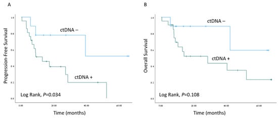 The median follow-up time was 16.5 months (range 6–76 months). Kaplan–Meier survival estimates revealed worse PFS when ctDNA was detected (p = 0.034), as depicted in Figure 3. A Cox regression model for the estimation of age-adjusted PFS revealed a hazard ratio of 4.36; 95% confidence interval 1.19–15.98 for detectable ctDNA (p = 0.026). Interestingly, the presence of TP53 mutations in tumor samples did not correlate with worse clinical outcomes (Figure S1).