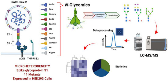 The S1 protein in the spike protein from the SARS-CoV-2 virus recognizes and binds the ACE2 receptor as the primary host cell infection route. The S1 protein is highly glycosylated; accordingly, several researchers have investigated the role of the protein glycosylation and its effect on virus infectivity and transmissibility [13,15,17,19,22,23,39]. In other viruses, researchers have found that glycans are a viral strategy to escape the host immune response, where the N-glycans mask the virus binding domains [54,55]. In a similar way, the S1 protein of the SARS-CoV-2 virus limits antibody access to protein neutralizing epitopes [54,56]. Therefore, a detailed glycome of the S1 protein derived from the virus’s mutations can provide insights into the pathobiology of the virus as well as vaccine development [57].