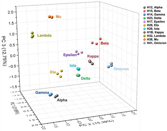 Figure 2. Three-dimensional principal component analysis (PCA), N-glycans of SARS-CoV-2 S1 protein variants: H12 alpha, H15 beta, H14 gamma, H17 delta, H14 epsilon, H29 eta, H28 iota, H1B kappa, H32 lambda, H38 mu, and H41 omicron. The VOC are all located in the lower section of the plot, which shows their glycosylation similarities.
