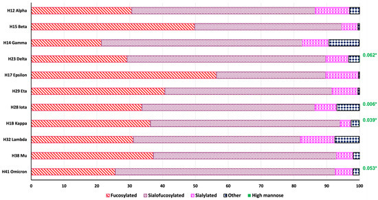 Figure 3. Bar plots of the relative abundance by N-glycan type. SARS-CoV-2 S1 protein variants: H12 alpha, H15 beta, H14 gamma, H23 delta, H17 epsilon, H29 eta, H28 iota, H1B kappa, H32 lambda, H38 mu, and H41 omicron. We observe that the primary contributor to the total protein glycosylation comes from the fucosylated and sialo-fucosylated N-glycan types. * High mannose abundances.