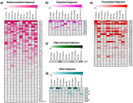 Heat maps were used to visualize the single N-glycan modifications across the analyzed variants, shown in Figure 4. The heat map of the sialofucosylated N-glycan type (Figure 4a) depicts a large abundance of the structures 4-5-1-1, 4-5-1-2, 4-4-1-1, 4-5-2-1, 5-6-1-3, 5-6-1-2, and 5-6-1-1, where most of them are present in the omicron variant. For the sialylated N-glycan types, the largest relative abundances were observed for the lambda, alpha, and epsilon variants, with 10.5, 10.5, and 10.0%, respectively. The variant with the lowest relative abundance of this glycan type was kappa with 3.3% (Supplementary Figure S5b). The sialylated N-glycan 4-4-0-1 was the most abundant structure across the variants, as shown in Figure 4b. The high mannose and the other N-glycan types were found to have significantly low relative abundance (Supplementary Figure S5d,e), where the glycans 2-8-0-0 and 7-5-0-0 were the most abundant structures. Additionally, the single changes in abundance of the mono-sialylated, di-sialylated, tri-sialylated, and tetra-sialylated N-glycan types can be observed in the heat maps described in Supplementary Figure S7.
