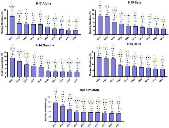 Figure 5. Top ten N-glycans, relative abundance. SARS-CoV-2 S1 protein variants of concern: H12 alpha, H14 gamma, H15 beta, H23 delta, and H41 omicron. Notice that the most abundant types of glycans observed in the S1 protein derived from the VOC are mono-fucosylated and mono-sialylated. The glycan nomenclature is described in Figure 1.