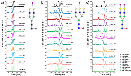 Figure 6. Extracted ion chromatograms (EICs) showing the isomeric expression of the N-glycans across SARS-CoV-2 S1 protein variants: (a) GlcNAc4, Hex5, Fuc, NeuAc; (b) GlcNAc5, Hex6, Fuc, NeuAc; and (c) GlcNAc4, Hex5, Fuc, NeuAc2. The stars (*) show the identified isoforms and glycan nomenclature as in Figure 1.