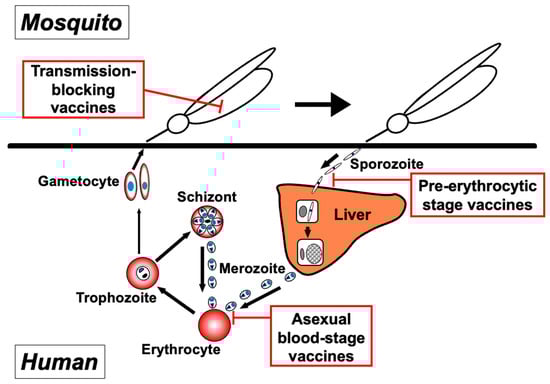 Malaria vaccines can be classified into three groups, each of which focuses on the specific developmental stages of the parasite: the pre-erythrocytic (sporozoite and liver stages), asexual blood (merozoite, trophozoite, schizont, and parasite-infected erythrocyte), and sexual stages within the bloodstream and the mosquito (gametocyte, gamete, and zygote/ookinete) (Figure 1).