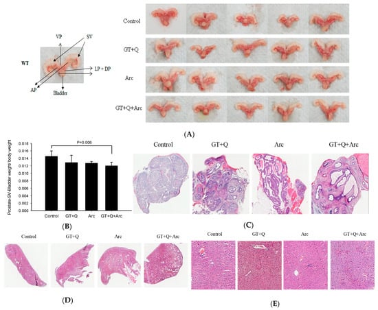 All control mice had hardened and enlarged prostates at the time of sacrifice, while the mouse prostates in the GT+Q+Arc group appeared normal (Figure 4A,B). The weight of the lower urogenital tract (bladder, seminal vesicles, and prostate) was slightly (but not significantly) reduced by both the GT+Q and Arc treatments compared to the control. In contrast, a significant reduction in the weight of the lower urogenital tract was achieved with the GT+Q+Arc treatment (Figure 4B). A pathological examination showed that all control mice had an invasive adenocarcinoma (Gleason score 8–10) as the primary lesion in the prostate. The primary lesion in the GT+Q and Arc groups was high-grade PIN (Gleason score 5–7), while in the GT+Q+Arc group, the dominant lesion was low-grade PIN (Gleason score 2–4) (Figure 4C). No metastasis was observed in the lung or liver in any of the groups (Figure 4D,E). These pathologic results corroborated the observations of significantly enhanced anti-tumorigenic strength by combining Arc with GT and Q.