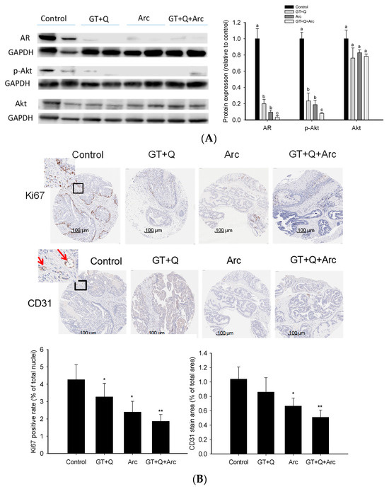 Modulation of signaling pathways/events by the combination treatment. The expression/phosphorylation of signaling molecules involved in the AR and PI3K/Akt pathways in the prostate/tumor tissues were analyzed with the Western blot method and are quantitated in (A). A prostate/tumor tissue section was formalin-fixed and paraffin-embedded for tissue microarray and immunohistochemical detection. Slides were cut and incubated with monoclonal antibodies for Ki67 and CD31 (for microvessel staining). Slides were counterstained with hematoxylin. Nuclei were stained in blue and Ki67 or CD31 in brown (B). The red arrows indicate microvessels (B). The positive rates of Ki67 nuclear staining and microvessel density are presented as mean ± SD (B). Con, control; GT, green tea; Q, quercetin, Arc: arctigenin. Different letters in each protein category indicate a significant difference between groups, p < 0.05. Compared to the control, * p < 0.05, ** p < 0.01. Original images can be found in Supplementary File S1.