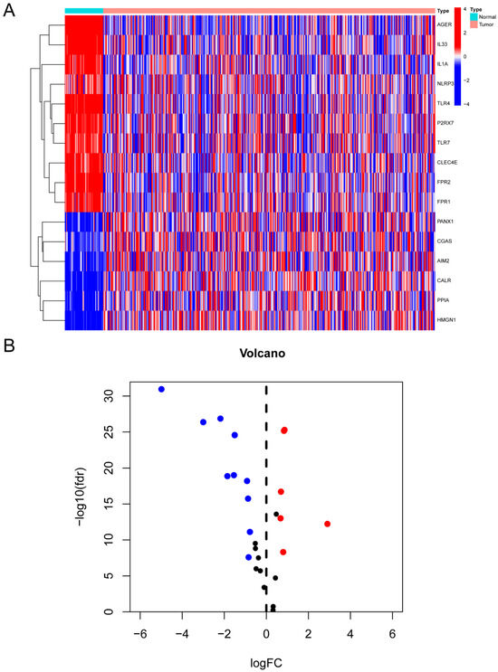 Identification of differentially expressed genes associated with DAMPs. Genes differentially expressed in normal tissues and LUAD associated with DAMP were shown in the heatmap (A) and volcano map (B).