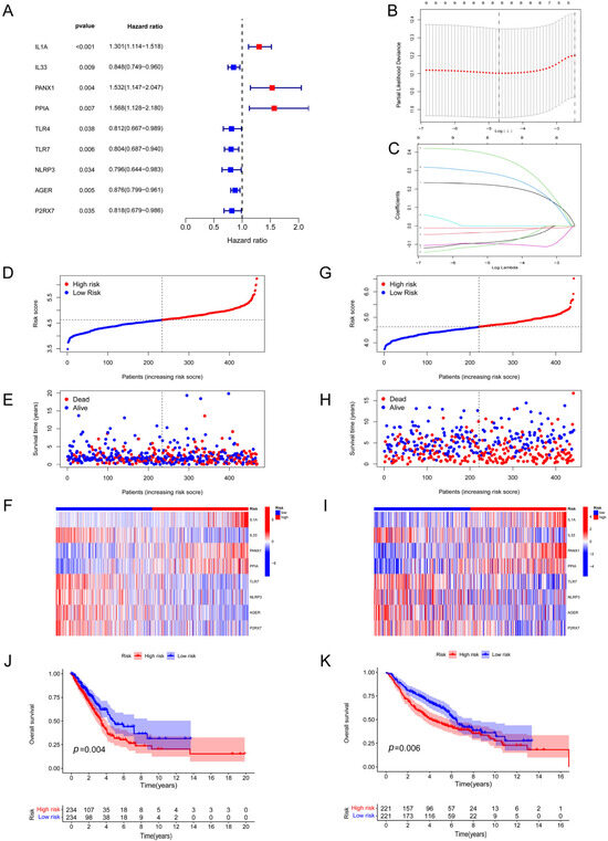 Construction and validation of a DAMP-based risk signature. (A) Univariate Cox analysis of DAMP-related prognostic DEGs. (B,C) Adjustment of coefficient profiles of 9 prognostic genes using LASSO regression analysis. (D–F) Risk score distribution (D), survival status of each patient (E), and heatmap of the prognostic 8-gene signature (F) in the TCGA database. (G–I) Risk score distribution (G), survival status of each patient (H), and heatmaps of the prognostic 8-gene signature (I) in the GEO database. (J,K) Kaplan–Meier analysis of the prognostic significance of the risk model in TCGA and GEO databases.