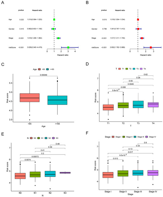 Correlation between the risk signature and clinical characteristics. (A) Univariate Cox analysis to assess the relationship between risk scores, clinical characteristics, and overall survival of patients with LUAD. (B) Multivariate Cox analysis to identify independent risk factors for overall survival in patients with LUAD. (C–F) Association of age (C), T stage (D), N stage (E), and pathological stage (F) with risk scores in patients with LUAD.