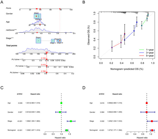 Constructed a nomogram combining the risk score and clinical characteristics. (A) Integration of clinical characteristics and risk scores to construct a nomogram to predict overall survival in patients with LUAD. (B) Calibration curves for the clinical prognostic nomogram. (C,D) Univariate and multivariate Cox analyses to assess the prognostic value of the nomogram. *** p < 0.001.