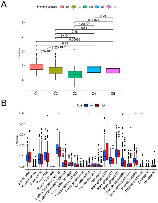 Differences in the immune features between the different risk groups. (A) Distribution of risk scores across the six different immune subtypes. (B) Differences in immune cell infiltration between the high- and low-risk groups. (C) Differences in immune function between the high- and low-risk groups. * p < 0.05, ** p < 0.01, *** p < 0.001.