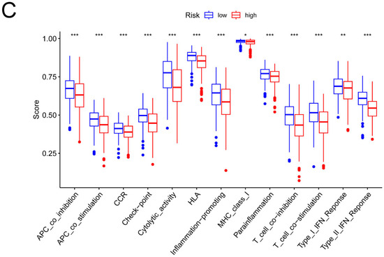 The function of ICD is not solely determined by the antigenicity owing to dying cells, but adjuvant properties and the immune microenvironment are also critical. The spatially and temporally coordinated release or exposure of DAMPs gives them adjuvant properties and is needed for APCs to be recruited and mature [5,42]. Conditions in the immune microenvironment influence the initiation of adaptive immunity by immunogenic variant cells [43]. In a previous study, six immune subtypes were found in a study that characterized the immunological tumor microenvironment of 33 TCGA-analyzed tumors using an immunogenomic method, with C4 and C6 having the poorest prognosis compared to C3, which had a more favorable outcome [20]. In our study, the risk scores of C4 and C6 were high, while C3′s risk scores were low. In addition, it is noteworthy, in the group with low risk, that immune functions like T cell co-stimulation and immune checkpoints were activated, indicating that these patients responded better to ICB therapy compared to the other group.