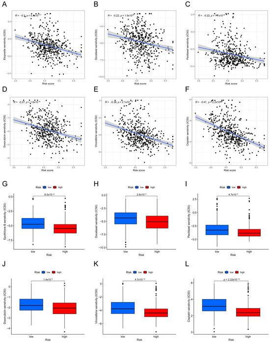 Differences in the chemotherapeutic drug sensitivity of different risk groups. (A–F) Correlation of sensitivity to Etoposide (A), docetaxel (B), paclitaxel (C), doxorubicin (D), vinorelbine (E), and cisplatin (F) with risk scores in patients with LUAD. (G–L) Differences in sensitivity to Etoposide (G), docetaxel (H), paclitaxel (I), doxorubicin (J), vinorelbine (K), and cisplatin (L) in the high- and low-risk groups of LUAD patients.
