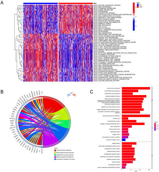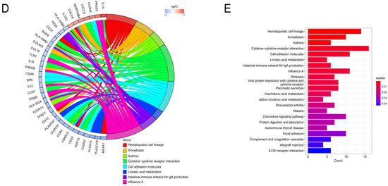 With the aim of investigating the diverse functions of different risk groups, KEGG enrichment analysis was implemented together with GO enrichment analysis. In addition, utilizing GSVA enrichment analysis, we assessed the stimulation of biological signaling pathways within the two risk groups. Compared to the high-risk group, in the low-risk group, significant enrichment of the Fc epsilon RI, T, and B cell receptor signal pathways were observed (Figure 8A). Additionally, 391 DEGs were discovered between the two groups, and these DEGs were used for additional enrichment analyses. They were predominantly engaged with a variety of biological processes, such as humoral immune, antimicrobial humoral, antibacterial humoral, leukocyte-mediated immunity, and bacterial defense response, according to the findings of the GO enrichment analysis (Figure 8B,C). Furthermore, signaling pathways like hematopoietic cell lineage, amoebiasis, asthma, cytokine–cytokine receptor interaction, and cell-adhesion molecules were identified using KEGG enrichment analysis (Figure 8D,E).
