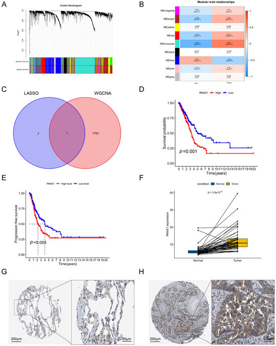 The diagnostic and prognostic value of PANX1 in LUAD. (A) Gene dendrogram of WGCNA. (B) Heatmap of the relationship between modules and LUAD traits. (C) Venn diagram of core module genes and genes involved in LASSO model taking the intersection. (D) Kaplan–Meier analysis of the prognostic significance of PANX1 in TCGA databases. (E) Progression-free survival analysis of PANX1 in high- and low-expression groups. (F) Paired analysis of PANX1 expression differences in normal and tumor tissues. (G,H) Immunohistochemical picture of PANX1 expression in normal (G) and tumor tissues (H) obtained from the HPA database.