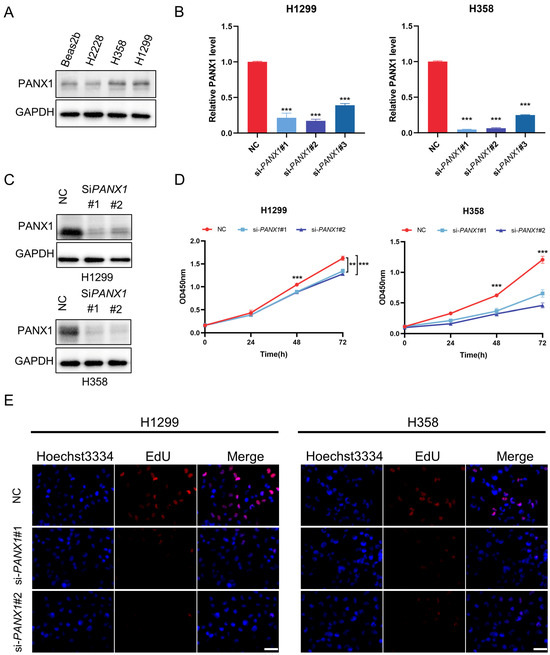To assess the expression levels of PANX1 in LUAD cell lines (H1299, 358, H2228) and a normal lung epithelial cell line (BEAS-2B) and to confirm the transfection efficiency of si-PANX1 in H1299 and H358 cells, Western blot experiments were conducted. Upon reaching an appropriate cell density in the culture dish, RIPA cell lysis buffer (100:1:1) supplemented with pre-added protease and phosphatase inhibitors was used for cell lysis on ice for 20–30 min, followed by centrifugation to collect the supernatant. The protein concentration was determined using the BCA method, and the calculated protein concentration was based on the measured OD value. Subsequently, 5× protein loading buffer was added, and the mixture was heated to 100 °C for 10 min. A 10% SDS-PAGE gel was prepared for electrophoresis, and 20 μg protein samples were loaded into each well. After transferring the protein samples to PVDF membranes, we first incubated the protein-containing PVDF membranes with 5% skim milk and then used anti-PANX1 (1:4000, 12595-1-AP, Proteintech, Wuhan, China) and anti-GAPDH (1:10,000, 60004-1-Ig, Proteintech, Wuhan, China), two primary antibodies, which were incubated on the membrane. Next, they were incubated with secondary antibodies (1:5000, BA1050, BA1054, Boster, Wuhan, China) for 2 h at room temperature. Finally, we used ECL reagents to perform protein expression assays.
