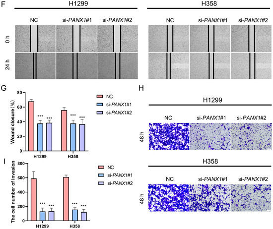Given the above results indicating the high expression of PANX1 in H1299 and H358, we proceeded to investigate the pivotal role of PANX1 in LUAD by transfecting LUAD cell lines H1299 and H358 with siRNA-PANX1 to downregulate the expression of PANX1. After confirming the effectiveness of the PANX1 knockdown with PCR and Western blot assays (Figure 10B,C), we found the findings of the Cell Counting Kit-8 and EdU tests demonstrated that the reduction in PANX1 decreased cell proliferation; meanwhile, cell invasion was inhibited, as determined by the wound-healing experiment and transwell test (Figure 10D–I). These experimental results indicated that PANX1 was a key molecule for tumor growth and metastasis, which may contribute to a worse prognosis for patients with lung adenocarcinoma.