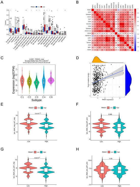The relationship between PANX1 and immunity. (A) Relationship between PANX1 and immune cell infiltration. (B) Association between PANX1 and immune checkpoints. (C) Association between PANX1 and immune subtypes. (D) Relationship between PANX1 and TMB. (E–H) Relationship between PANX1 and TCIA immunotherapy. * p < 0.05, ** p < 0.01, *** p < 0.001.