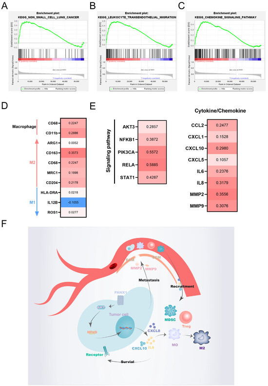 Using GSEA analysis, PANX1 was found to be strongly associated with non-small cell lung cancer, leukocyte transendothelial migration, and cytokine signaling pathways (Figure 12A–C). Macrophages play an important role in the immune microenvironment, and further exploration of the relationship between PANX1 and macrophages revealed a significant positive correlation between PANX1 and M2 macrophage markers (Figure 12D). Further exploration of the possible causes revealed that PANX1 was positively correlated with important molecules in the cytokine pathway such as NFκB, AKT, and other factors such as IL6, CXCL8, and CXCL10, which are associated with inhibitory immune cell recruitment and macrophage polarization. In addition, PANX1 was closely associated with MMP2 and MMP9, which are factors associated with cell migration (Figure 12E). The relationship between PANX1 and the immune microenvironment is demonstrated in Figure 12F.