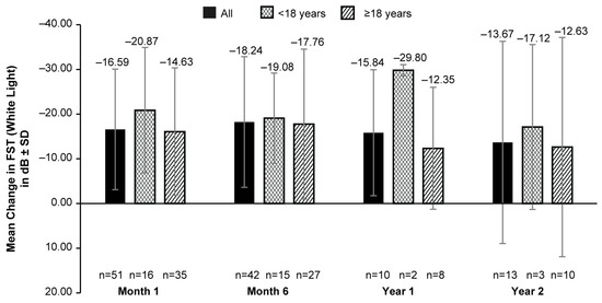 The mean (SD) FST was −4.56 (10.88) dB (127 eyes) at BL. An increase in white-light sensitivity from BL was reported as early as month 1’s (mean [SD] change in BL: −16.59 [13.48] dB; 51 eyes); the highest value was reported in month 6’s (mean [SD] change in BL: −18.24 [14.62] dB; 42 eyes). A slightly lower improvement was observed in years 1 and 2. However, the data available for these timepoints were limited (Figure 1). A numerically higher improvement in light sensitivity was observed in patients aged <18 years compared to those aged ≥18 years at all time points with a mean (SD) change from BLs of −29.80 (1.27) dB (2 eyes) dB vs. −12.35 (13.64) dB (8 eyes) and −17.12 (18.44) dB (3 eyes) vs. −12.63 (24.52); dB (10 eyes) at years 1 and 2, respectively (Figure 1). However, the data were only available for a very limited number of patients for this comparison.