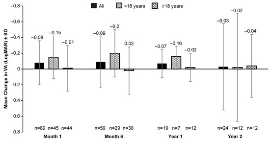The mean BL VA (LogMAR) was 1.14 (0.57; 148 eyes). No clinically meaningful change in the mean VA was observed from BL up to year 2 with data from fewer patients available post-VN treatment (mean [SD] change from BL: −0.03 [0.55; 24 eyes]; Figure 2). Patients aged <18 years had some improvement (mean [SD] change in BL of 0.15 [0.27] at month 1 (45 eyes), −0.20 [0.30] at month 6 (29 eyes), and −0.16 [0.13] at year 1 (7 eyes) in VA post-VN administration when compared to adult patients (mean (SD) change in BL of −0.01 [0.29] at month 1 (44 eyes), 0.02 (0.30) at month 6 (30 eyes), and −0.02 [0.18] at year 1 (12 eyes)) at all timepoints except year 2 (<18-years-old group: −0.02 [0.69], 12 eyes; ≥18-years-old group: −0.04 [0.40], 12 eyes) (Figure 2).