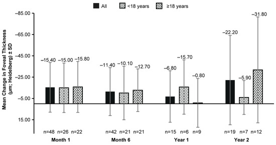The mean (SD) foveal thickness on the OCT at BL was 209.2 (45.82) µm (117 eyes). No clinically significant change in BL was observed in the mean (SD) foveal thickness up to year 2 (−22.20 [41.92] µm; 19 eyes; Figure 3) with an inconsistency of the data availability at all time points (Figure 3).