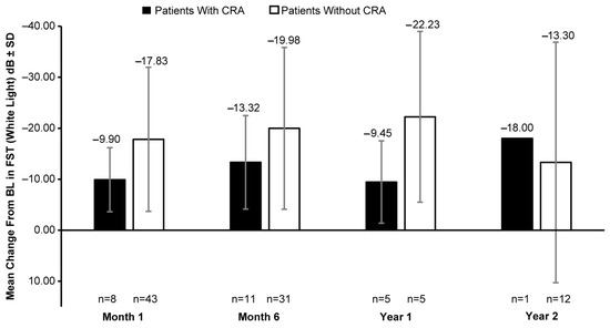 A clinically meaningful increase in the mean FST (white light) was observed in patients with and without CRAs post BL. In patients with CRAs, the mean (SD) change in BL was −9.90 (6.28) dB at month 1 (8 eyes), −13.32 (9.16) dB at month 6 (11 eyes), −9.45 (8.07) dB at year 1 (5 eyes), and −18.00 dB at year 2 (1 eye). However, a greater increase in white-light sensitivity was observed in patients without CRAs than those with CRAs at all timepoints, except year 2; the mean (SD) change in FST (white light) from BL was −17.83 (14.13) dB at month 1 (43 eyes), −19.98 (15.87) dB at month 6 (31 eyes), −22.23 (16.74) dB at year 1 (5 eyes), and −13.30 (23.58) dB at year 2 (12 eyes) (Figure 4). The mean VA at BL was 0.89 (0.50) LogMAR in 19 eyes with CRAs compared to 1.18 (0.57) LogMAR in 129 eyes without CRAs. Overall, no meaningful change in BL was observed up to year 2 (Figure 5).