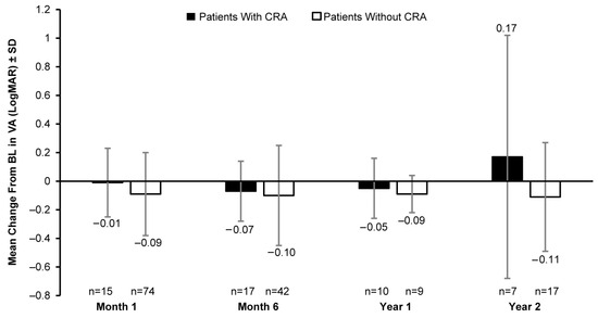 Mean change in VA (LogMAR) from baseline in patients with CRAs versus those without CRAs. VA, visual acuity; BL, baseline; CRA, chorioretinal atrophy; LogMAR, logarithm of minimum angle of resolution; n, number of eyes. Baseline data are available for 19 eyes with CRAs and 129 eyes without CRAs. Error bars indicate SD.