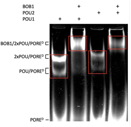 Separation of POU1, POU1/BOB1, POU2, and POU2/BOB1 complexes using EMSA. A fluorescein-labeled double-stranded oligonucleotide containing PORED [,] was used as a reference for complex mobilities. In a parallel EMSA, which was run with the same recombinant proteins but random oligonucleotides, the zones marked with red rectangles were excised and used for DNA extraction and amplification during four consecutive rounds of the EMSA–SELEX procedure, ending with NGS sequencing. Original image can be found in File S5.