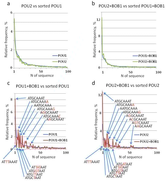 Comparative analysis of relative frequencies of individual sequences enriched by the EMSA–SELEX–seq in complexes with POU1, POU2, and BOB1. The top 100 sequences matching the ANNNNAAN pattern were sorted in a descending order by relative frequencies and compared pairwise on the plot as indicated above each chart. The relative frequencies of individual octamer sequence variants, while comparing DNA samples from complexes with POU1 and POU2 (a) and from complexes with POU1 + BOB1 and POU2 + BOB1 (b), were nearly indistinguishable. On the contrary, a similar comparison of DNA sequences from POU1+BOB1 and POU1 (c) and from POU2 + BOB1 and POU1 complexes (d) produced positive and negative peaks, indicating a significant influence of BOB1 presence on the relative frequencies of several sequences. Some of these peaks are denoted, while the complete list of individual sequences with their relative frequencies in these pairs can be found in Table S2a–d. Nucleotides different from those in the canonical octamer motif (ATGCAAAT) are colored in red.