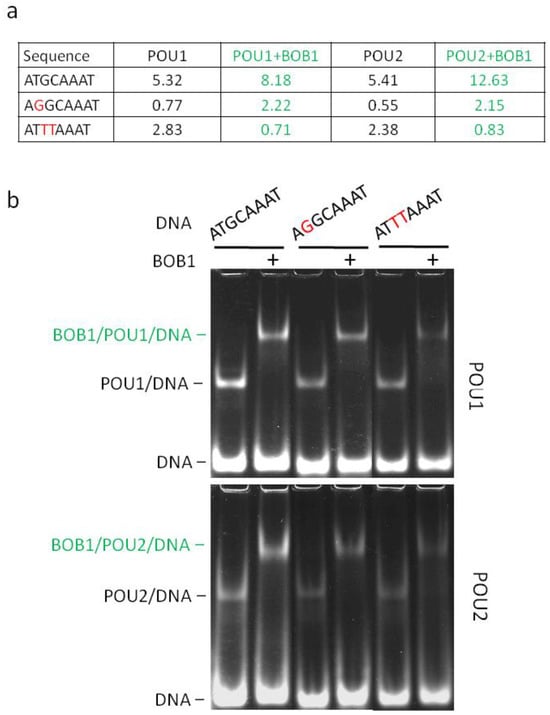 The following supporting information can be downloaded at https://www.mdpi.com/article/10.3390/biom14010123/s1, Figure S1: Schematic representations of DNA cassettes inserted into the pET28a plasmid for bacterial expression of N- and 10 C-tagged full-length BOB1 and the POU domains of OCT1 (POU1) and OCT2 (POU2); Figure S2: Analysis of bacterially expressed and purified POU1, POU2, and BOB1 proteins using SDS-PAGE (12%); Figure S3: Minor motifs, identified by the STREME online tool, that exhibited p-values < 0.05 and could not be matched to 41 any known POU-domain-binding motifs; Table S1: Sorted by freqsum; Table S2: (a) Sorted by POU1, (b) Sorted by POU1 + Bob1, (c) Sorted by POU1, (d) Sorted by POU2; Table S3: (a) Sorted by POU1 + Bob1, (b) Sorted by POU2 + Bob1; Files S1–S6.