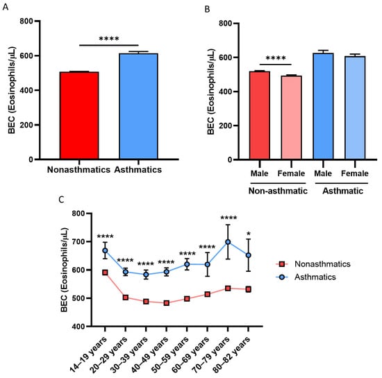 Asthmatic subjects are characterized by higher eosinophilia regardless of sex and age. BEC in (A) asthmatic and nonasthmatic subjects, (B) according to sex and (C) according to age range (14–82 years). * = p < 0.05; **** = p < 0.0001. BEC: blood eosinophil count.