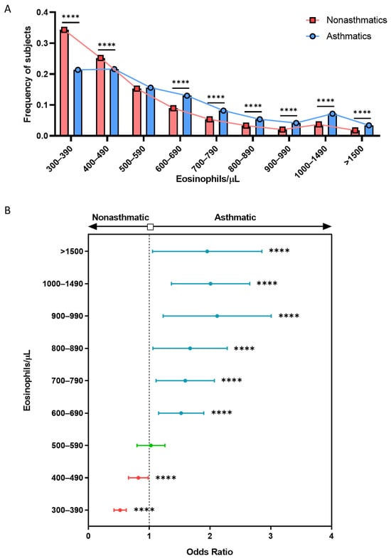 As our results confirm, eosinophilia tends to be higher among individuals with asthma, as previously described [,], and this pattern is independent of subjects’ age. In our study, the threshold most closely related to the presence of asthma is 600 eosinophils/µL, considering a population with already 300 blood eosinophils/μL. This finding contrasts with previous reports showing that the median blood eosinophil counts range from 157 to 280 cells/µL for asthma and 200 to 400 cells/µL for severe asthma, while controls and the general population have blood eosinophil counts of 100–160 cells/µL and 100–200 cells/µL, respectively [].