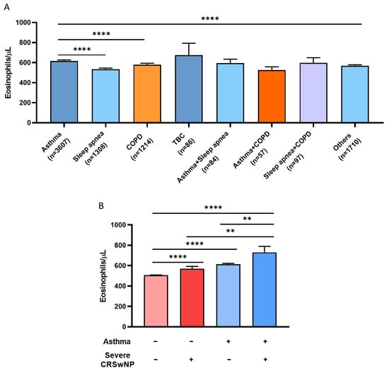 Asthma and CRSwNP are associated with higher eosinophilia than other respiratory diseases. (A) BEC in subjects with respiratory pathologies. (B) BEC in subjects with CRSwNP, with asthma, with both diseases, or with neither asthma nor CRSwNP (−/−). ** = p < 0.005; **** = p < 0.0001. BEC: blood eosinophil count; CRSwNP: chronic rhinosinusitis with nasal polyps. + sign represents presence of the disease and − sign represents absence of the disease.