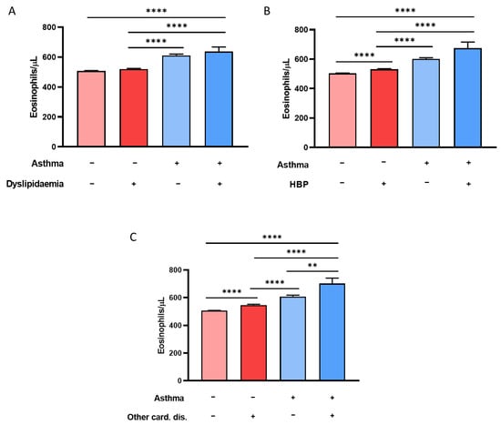 Cardiovascular diseases are associated with eosinophilia in asthmatic patients. (A) BEC in non-diseased subjects and subjects with dyslipidemia, with asthma, and with both. (B) BEC in non-diseased subjects, with HBP, with asthma, and with both. (C) BEC in non-diseased subjects (−/−) and in subjects with other cardiac pathologies, with asthma, and with both. ** = p < 0.005; **** = p < 0.0001. BEC: blood eosinophil count; HBP: high blood pressure. + sign represents presence of the disease and − sign represents absence of the disease.