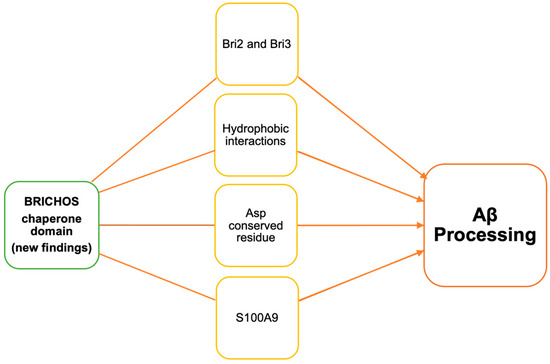 A chaperone that is due for major discussion is the BRICHOS chaperone domain. As shown in Figure 2, all BRICHOS-containing proteins have an N-terminal cytosolic segment, a hydrophobic transmembrane or a signal peptide region, a linker segment, and the BRICHOS domain. The C-terminal segment is present in all BRICHOS except proSP-C [21]. Recent studies have shown this chaperone’s involvement in Aβ processing in various ways (Table 2, Figure 3). Österlund et al. (2022) used structure prediction algorithm AlphaFold2 and mass spectrometry (MS) to define the BRICHOS domain’s interaction with Aβ. They used the BRICHOS-domain containing proform of lung surfactant protein C (proSP-C) for X-ray crystallography [49]. This proSP-C protein is reported to inhibit AB fibrilization [50]. Furthermore, Shimozawa et al. showed that BRICHOS interacts with multiple proteins [51]. They used mice brain slice cultures incubated with recombinant BRICHOS Bri2 to perform proteomic analysis. They detected the binding of the Spectrin alpha chain, Spectrin beta chain, Myosin-10, unconventional Myosin-Va, Drebrin, Tubulin beta-2A chain, and Actin cytoplasmic 1 to BRICHOS Bri2. However, in this study, there was no interaction between Aβ and BRICHOS Bri2 observed, possibly due to the already formed Aβ aggregates in plaques in this brain slice culture model. Overall, Shimozawa’s study suggests that BRICHOS Bri2 may play an important role in cytoskeleton regulation.