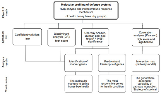 The statistical analysis, designed as illustrated in Figure 1, was conducted using Microsoft Excel 2016 and XLSTAT software (Addinsoft Pearson Edition 2014, Addinsoft, Paris, France). Specifically, the categorization of honey bees into groups was plotted using Discriminant Analysis (DA). Although DA is one of the most common data reduction techniques, it suffers from two main problems: Small Sample Size (SSS) and linearity problems [16]. Therefore, DA needs to be complemented by other statistical analyses [17]. The mean, standard deviation, and variance of each gene were calculated using descriptive statistics and visualized using the Heat map module. Gene expression variation was measured as the % coefficient of variation (CV) of gene expression [18]. For the gene expression analysis, ANOVA was used to test overall effects, followed by the Duncan post hoc test (p < 0.05) for multiple comparisons of gene expression between groups of honey bees.