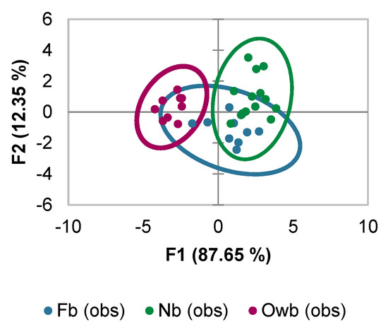 Variables were ranked depending on their discriminating properties. For this, classification functions (the linear discriminant function) across each group were used because they are helpful in deciding which variable affects classification more. Out of the ten significantly discriminant functions, only the two (spz and domeless) most relevant functions and, hence, marker candidates, were used to build a standardized discriminant coefficient biplot to differentiate the Owb, Nb, and Fb honey bees.