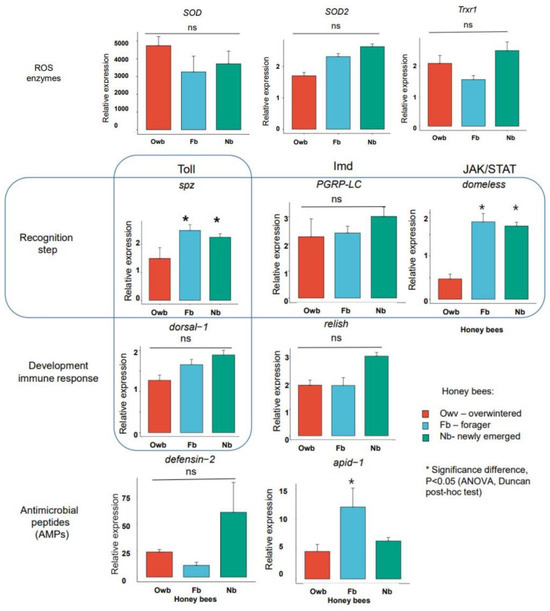 Molecular profiling of the defense system of honey bees that were sampled in February (Owb, overwintered honey bees, winter population) and in April (newly emerged bee, Nb; forager bee, Fb; spring population), was performed by analyzing the expression of ten genes: spz and dorsal-1 (Toll pathway), PGRP-LC and relish (Imd pathway), domeless (JAK/STAT pathway), defensin-2 and apid-1 (antimicrobial peptides, AMPs), SOD, SOD2, and Trxr1 (antioxidative defense genes coding ROS enzymes).