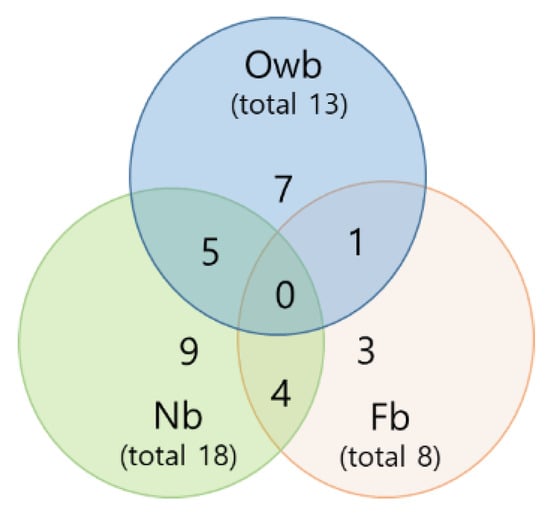 Venn diagram comparing the honey bee molecular profiling based on interactions between ten genes of the defense system through significant correlations (moderate and higher). Owb—overwintered bees of the winter population; Nb—newly emerged bees; and Fb—forager bees of the spring population.
