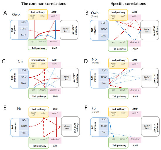 Correlation analysis of the honey bee defense system through reporter gene interactions. (A,B) represent the winter population (Owb); (C,D) represent the spring population of newly emerged bees (Nb); and (E,F) represent the spring population of forager (Fb) honey bees. The solid line indicates common interactions of Nb and Fb with the Owb correlations. The dashed line represents common interactions within the spring population (Nb and Fb). Negative correlations are shown in blue, and positive correlations in red. Low and negligible correlations were excluded.