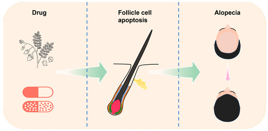 Chemotherapy-induced alopecia (CIA) is a common adverse effect in patients receiving chemotherapy and manifests as patchy or diffuse anagen alopecia that may progress to complete hair loss within 2–3 months [130]. There are two forms of damage attributed to CIA: One is the dystrophic anagen phase, in which hairs are stimulated by low doses of chemotherapeutic drugs, manifesting in an outgrowth of the hair shaft and damage to the structure of the hair follicle, which returns to the second cycle, during which hair loss is rare. The other is the dystrophic catagen phase, which refers to the destruction of the hair follicle structure after receiving high doses of chemotherapeutic drugs, characterized by the fragmentation of melanocytes, rapid and massive hair loss, and a rapid subsequent growth cycle within a short period of time [131].