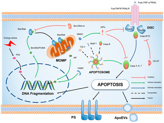 The intrinsic apoptotic pathway is elicited and propelled by diverse perturbations within the microenvironment, including the deprivation of growth factors, DNA damage, endoplasmic reticulum stress, accumulation of reactive oxygen species, replicative stress, microtubule aberrations, and mitotic defects [45,46,47].