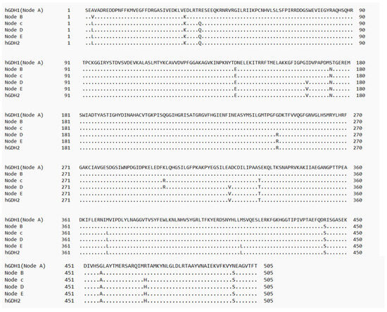 The five amino acid sequences corresponding to the evolutionary steps, along with hGDH1 and hGDH2, were aligned using the BLASTP tool (https://blast.ncbi.nlm.nih.gov/Blast.cgi?PAGE=Proteins), accessed on 21 November 2023. (Figure 2).