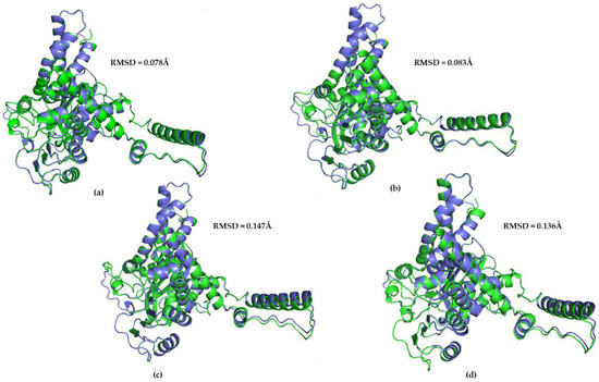 Superposition of the model structure corresponding to hGHD2 (blue) with every predicted structure model for each ape (green). (a) Chimpanzee—hGHD2. The RMSD value was estimated to be 0.078 Å. (b) Gorilla—hGHD2, RMSD value: 0.083 Å. (c) Orangutan—hGHD2, RMSD value: 0.147 Å. (d) Gibbon—hGHD2, RMSD value: 0.136 Å.