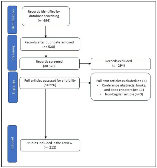 - Page, M.J.; McKenzie, J.E.; Bossuyt, P.M.; Boutron, I.; Hoffmann, T.C.; Mulrow, C.D.; Shamseer, L.; Tetzlaff, J.M.; Akl, E.A.; Brennan, S.E.; et al. The PRISMA 2020 Statement: An Updated Guideline for Reporting Systematic Reviews. BMJ 2021, 372, n71. [Google Scholar] [CrossRef] [PubMed]