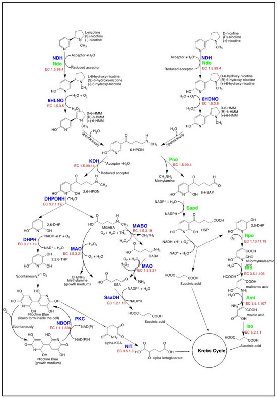 - Gurusamy, R.; Natarajan, S. Current Status on Biochemistry and Molecular Biology of Microbial Degradation of Nicotine. Sci. World J. 2013, 2013, 125385. [Google Scholar] [CrossRef] [PubMed]