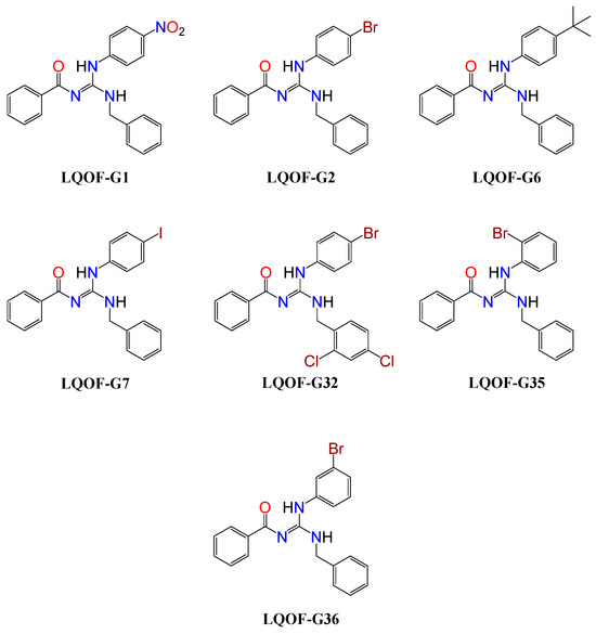 (Z)-N-benzoyl-N-benzyl-N-(4-nitrophenyl)guanidine (LQOF-G1),(Z)-N-benzoyl-N-benzyl-N-(4-bromophenyl)guanidine (LQOF-G2),(Z)-N-benzoyl-N-benzyl-N-(4-tert-butylphenyl)guanidine (LQOF-G6), (Z)-N-benzoyl-N-benzyl-N-(4-iodophenyl)guanidine (LQOF-G7), and(Z)-N-benzoyl-N-(2,4-di-chlorobenzyl)-N-(4-bromophenyl)guanidine (LQOF-G32) were synthesized as previously reported [12,13]. LQOF-G35 and LQOF-G36 are new compounds in this series. They are reported in this study and were synthesized using the same procedure [12].