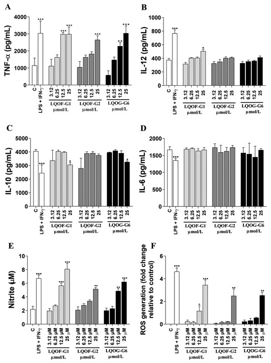 Immunomodulatory profile of LQOF-G1, LQOF-G2, LQOF-G6 in macrophages infected with Leishmania (Viannia) braziliensis. (A) TNF-α; (B) IL-12; (C) IL-10; (D) IL-6; (E) NO, and ROS (F) were evaluated using supernatant from cultured RAW 264.7 macrophages infected with L. (V.) braziliensis. Data represent the mean ± standard error of the mean of at least three independent experiments. Comparison between groups was performed by One-wayANOVA followed by Tukey’s post-test, where * p < 0.05; ** p < 0.01 and *** p < 0.001 compared to the control. LPS—lipopolysaccharide.