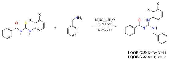 The synthesis of guanidines LQOF-G1, LQOF-G2, LQOF-G6, LQOF-G7 and LQOF-G32 have been reported earlier [12,13,14]. Considering the viability of this method and the high reaction yields, the synthesis of new guanidine compounds, LQOF-G35 and LQOF-G36 (Scheme 1), was carried out according to previously described methods [12].